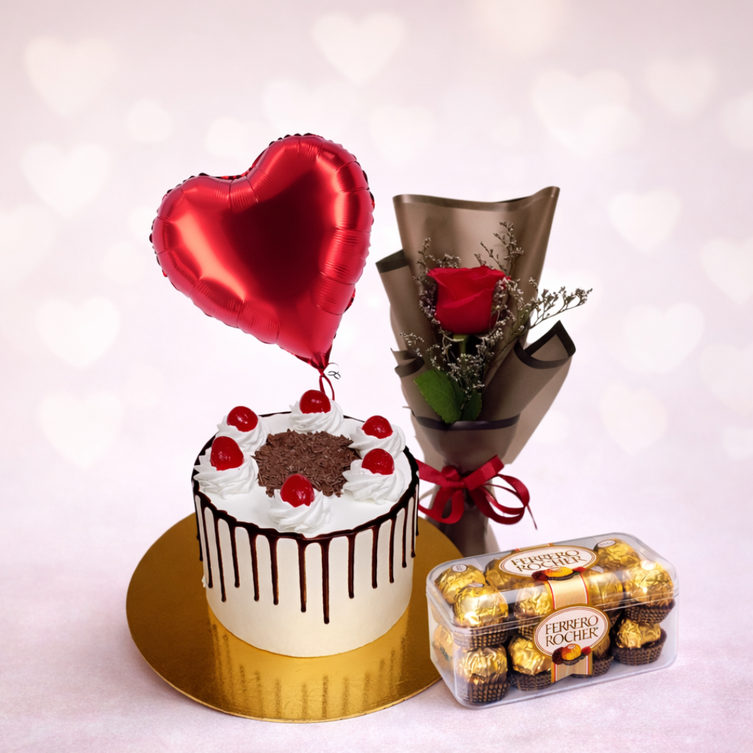 Mini black forest cake + 1 red rose + 1 heart balloon + small chocolate box