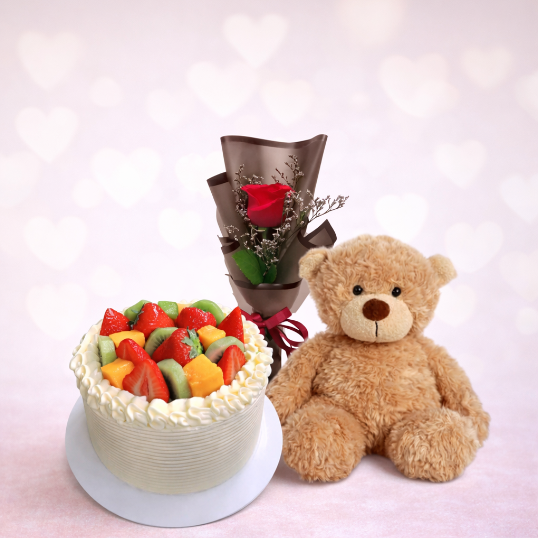 Celebrate sweet moments with this adorable combo featuring a fresh Mini Fruit Cake, a romantic Red Rose, and a cute medium-size Teddy Bear. A perfect gift to express love, warmth, and happiness for any special occasion.
